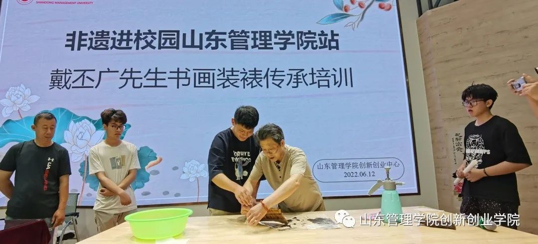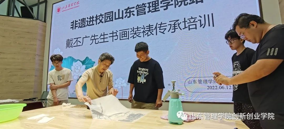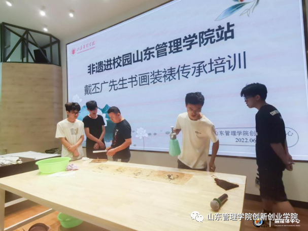 此次培训,戴丕广先生围绕装裱文化发展历程、装裱艺术历史传承、装裱艺术的基本技艺等多个方面向学生们进行讲述,装裱艺术的文化展示与师生亲自实践贯穿始终,让同学们感受古画装裱的不易,并探讨了现如今非遗传承面临的问题,引发了现场参与者的反思。通过本次培训、学习,期待激起学生对非遗、传承非遗的兴趣,并试图引导青年人去了解这份职业背后价值,扩大学生的职业选择。
