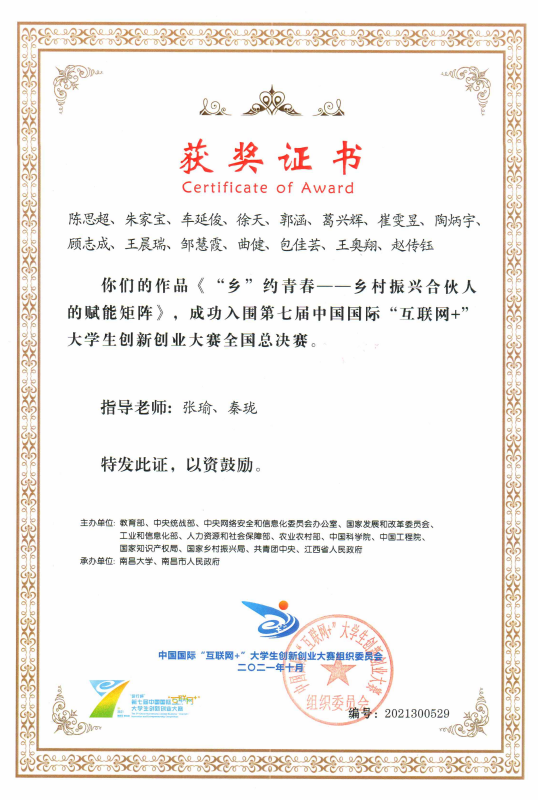 近日,第七届中国国际“互联网+”大学生创新创业大赛全国总决赛获奖名单公布,我校劳动关系学院毕业生陈思超和工商学院毕业生朱家宝主持、团委张瑜和工商学院秦珑指导的《“乡”约青春——乡村振兴合伙人的赋能矩阵》获国赛入围奖,实现了我校在该项赛事上国赛“零”的突破。