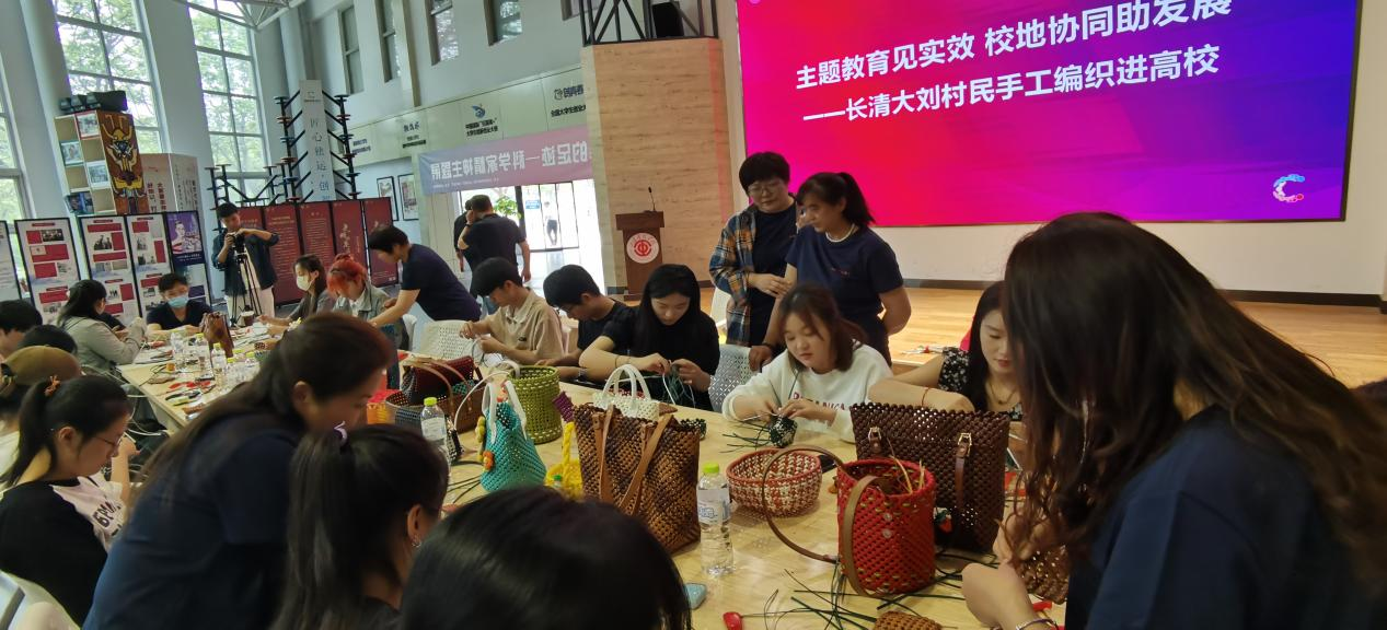 在编织技艺传承活动现场,刚刚授聘为皇冠333体育APP创业导师的来自大刘村的5名编织队员为同学们现场传授编织技艺。同学们学习热情高涨,在老师的带领下领略了手工编织的独特魅力,同时对文化+创新创业产生了浓厚的兴趣。